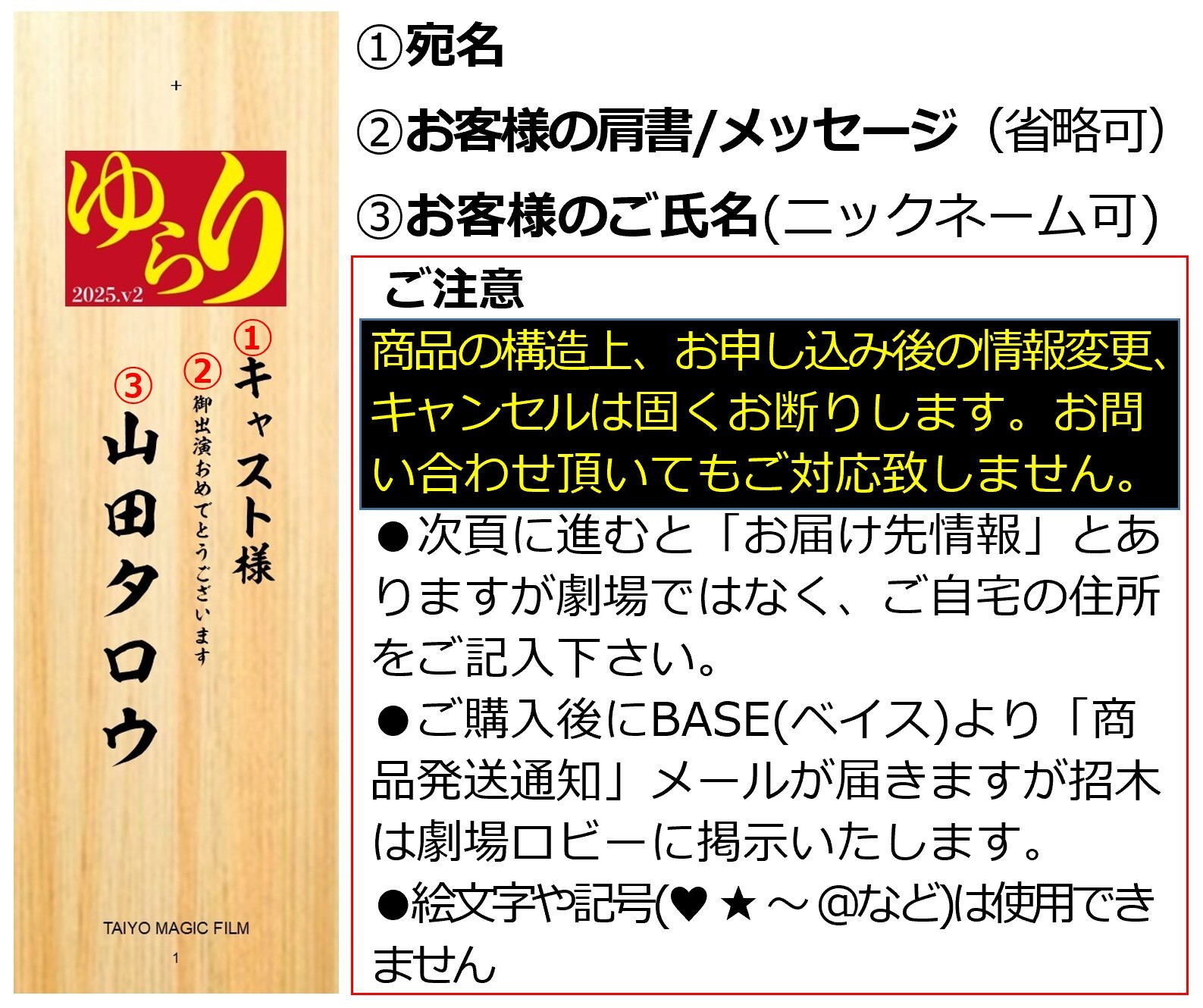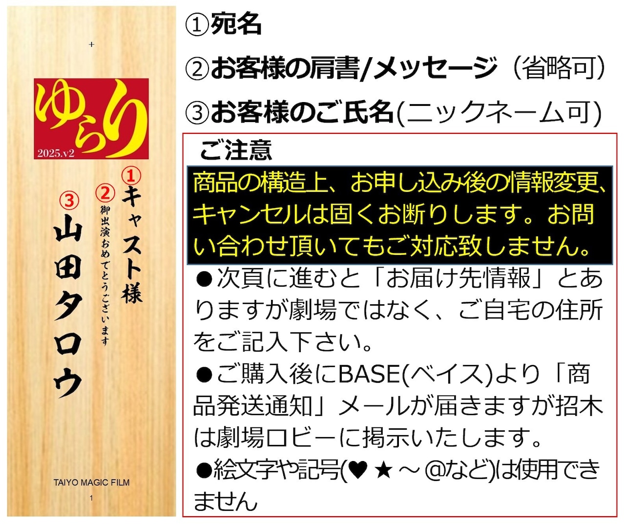 ※次のページに進むと「お届け先情報」の入力が必要になりますが、劇場住所ではなくご購入者様の情報をご入力ください。招木は公演会場にお届けします。