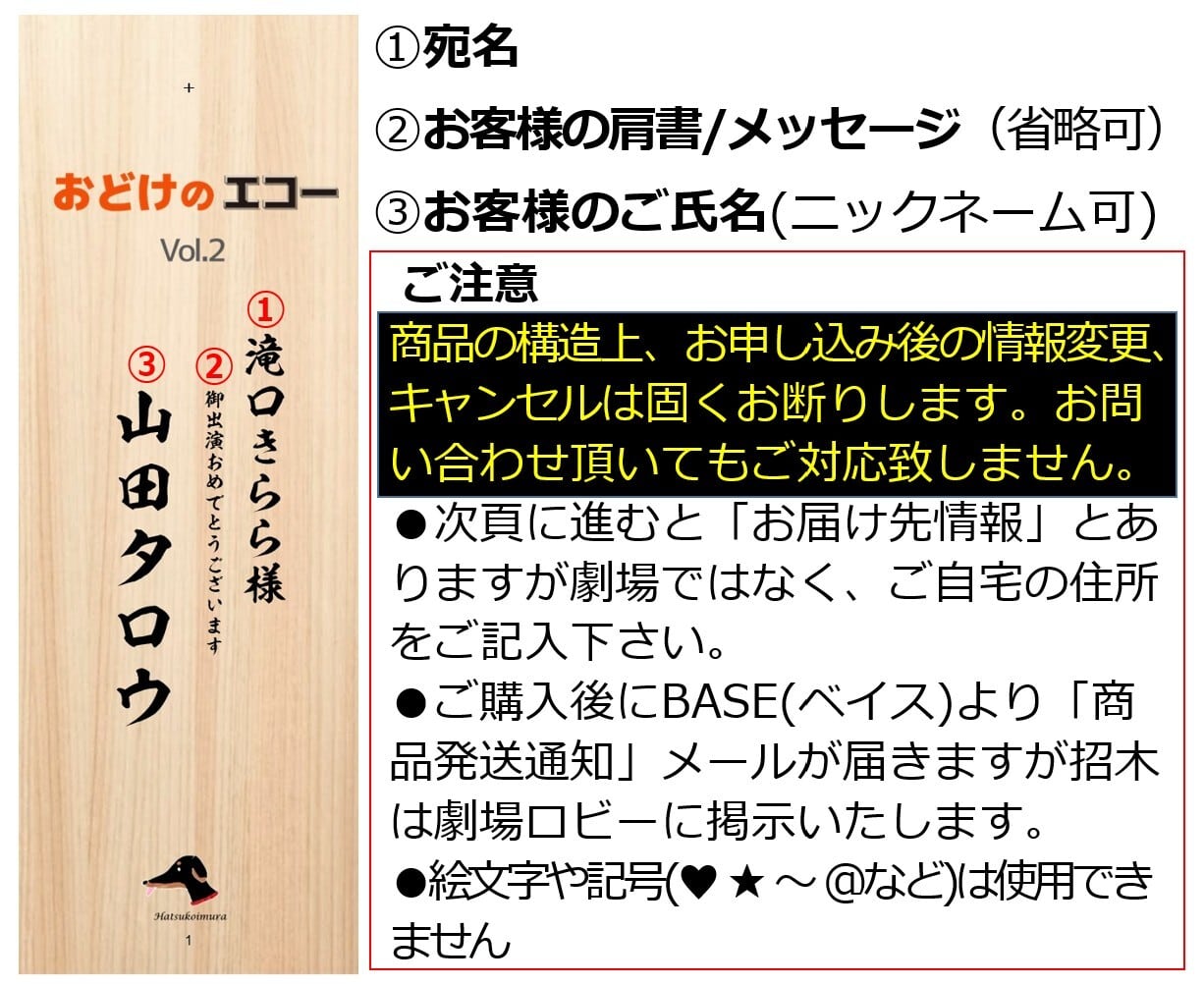 ※次のページに進むと「お届け先情報」の入力が必要になりますが、劇場住所ではなくご購入者様の情報をご入力ください。招木は公演会場にお届けします。