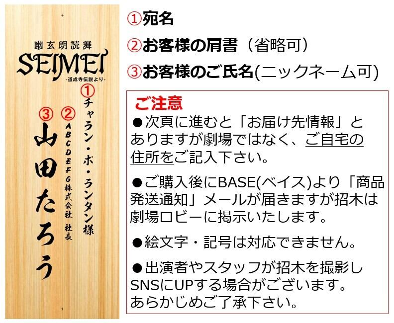 【招木の納品時期について】毎日19時に申込を締め切り、翌々日に劇場に納品します。ただしご注文が多く寄せられた場合、遅れる場合もございます。